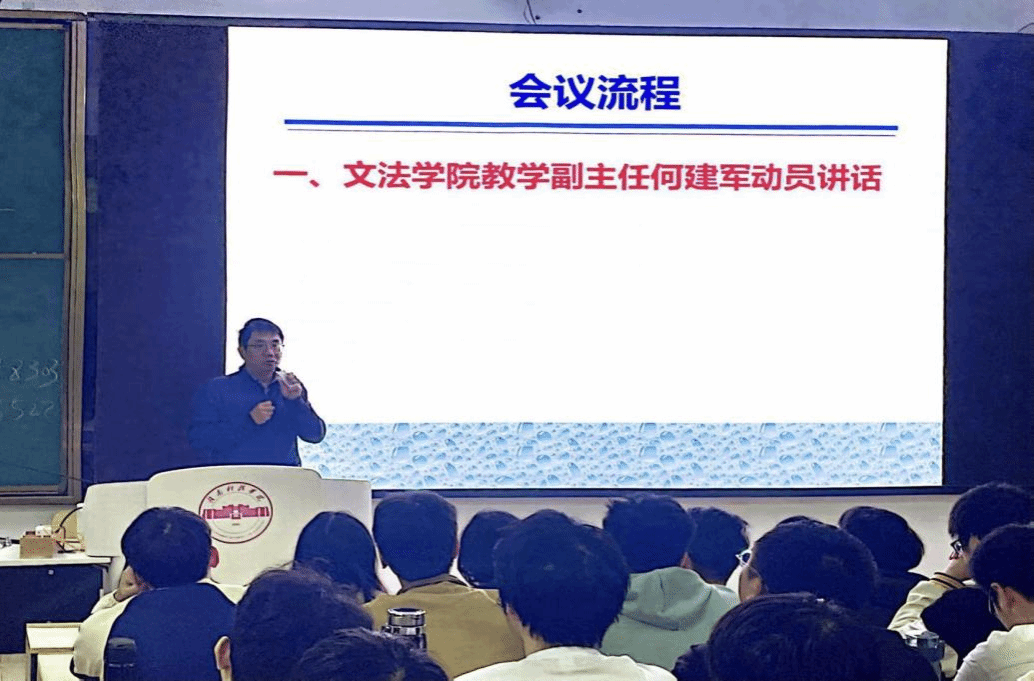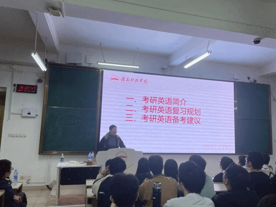 讲座开始,何建军教授强调了考研对于学生个人发展的重要性,并鼓励学生们充分利用学校提供的资源和平台,全面提升自己的学术研究能力。随后英语教研室的邱景老师和数学教研室的赖邦城老师分别就英语和数学的复习策略、备考安排进行了深入地讲解,为学生们提供了宝贵的建议和指导。