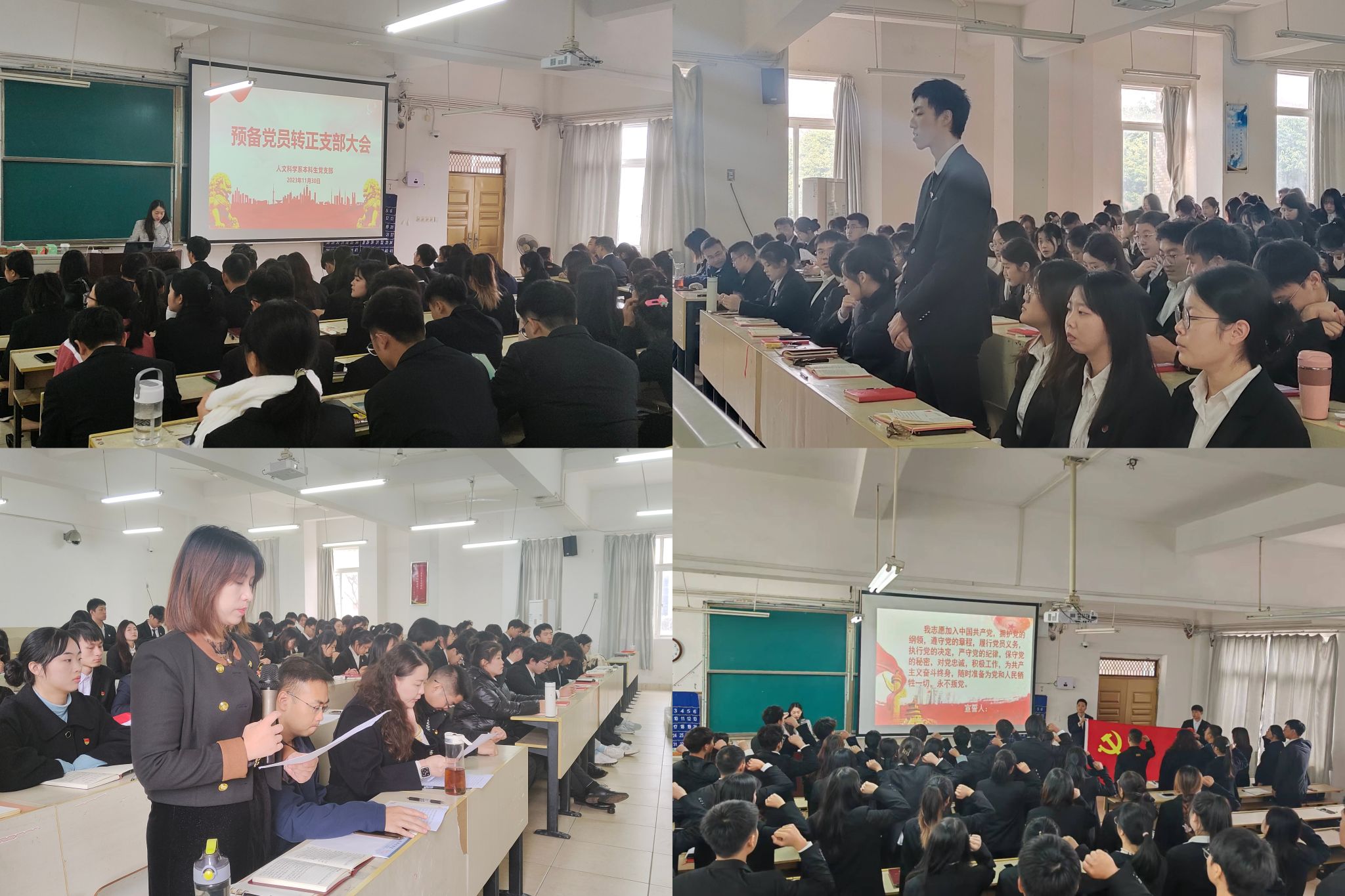 在会议第二阶段,举行党支部预备党员转正大会。首先,习梦雪等23名申请转正的预备党员汇报自己在预备期间的工作学习情况。随后,入党介绍人分别介绍习梦雪等23名预备党员在预备期的表现情况及意见,与会党员充分发表意见,对其能否转正展开充分讨论,并进行无记名投票表决。会议认为,申请人态度端正、立场坚定,在学习上刻苦努力,在工作上认真负责,在生活中乐于助人,充分发挥党员先锋模范作用,同意习梦雪等23位预备党员按期转为正式党员,希望他们能够在学习、工作、生活中进一步发挥先锋模范带头作用。