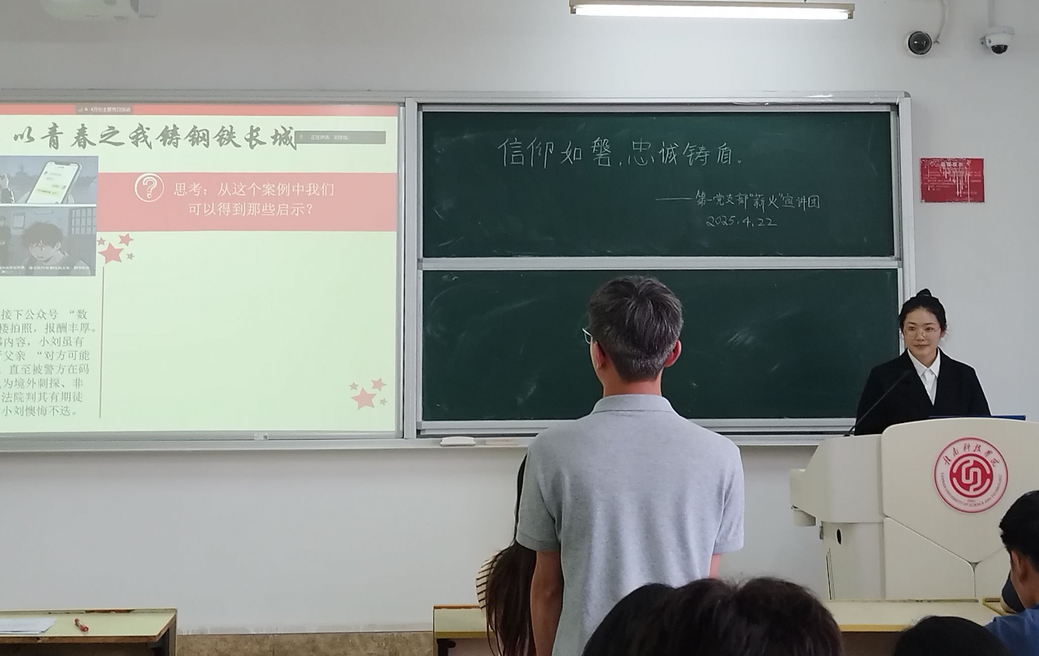 宣讲员黄怡祺从习近平总书记的梁家河岁月讲起,“跳蚤关、饮食关、劳动关、思想关”,青年习近平在艰苦环境中磨砺意志,带领村民打淤地坝、建沼气池,用实干诠释了“为人民做实事”的担当,用奋斗展现了“为人民谋幸福”的信仰。随后,宣讲员分享了“两弹一星”元勋邓稼先的感人事迹,28年隐姓埋名,在戈壁荒漠中带领团队攻克核技术难关,用生命践行“干惊天动地事,做隐姓埋名人”的初心誓言,为国家安全筑牢坚实防线。最后,宣讲员通过真实案例警示青年学子做到“筑牢思想防线、练就过硬本领、争做先锋表率”,并现场领誓:“做一块梁家河的热土,扎根中国大地;做一根永不生锈的钢钉,筑牢安全防线……”。