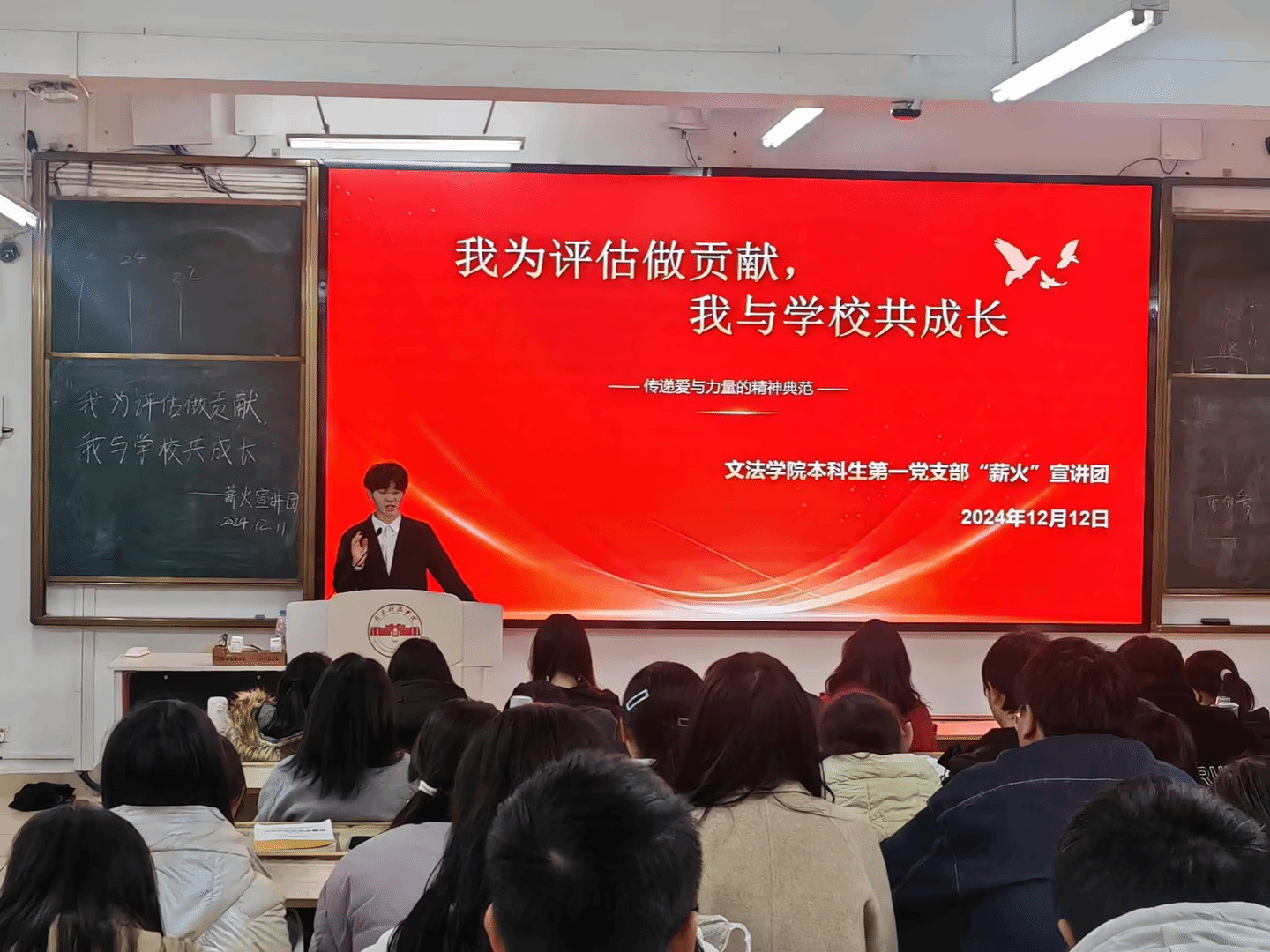 12月11日至12日,KY开元集团官网本科生第一党支部“薪火”宣讲团率先行动,面向全体2024级学生开展了主题宣讲活动。活动以“我为评估做贡献,我与学校共成长”为核心,宣讲员首先带领同学们共同学唱《赣科学子迎评歌》,通过歌声传递出对学校本科教学合格评估工作的重视与热情。随后,宣讲员邀请同学们分享身边的榜样故事,讲述优秀学长学姐和教师在学校本科教学合格评估工作中的先进事迹,这些生动的故事激励着每一位同学,让他们深刻认识到自己也能为学校迎评促建贡献青春力量。