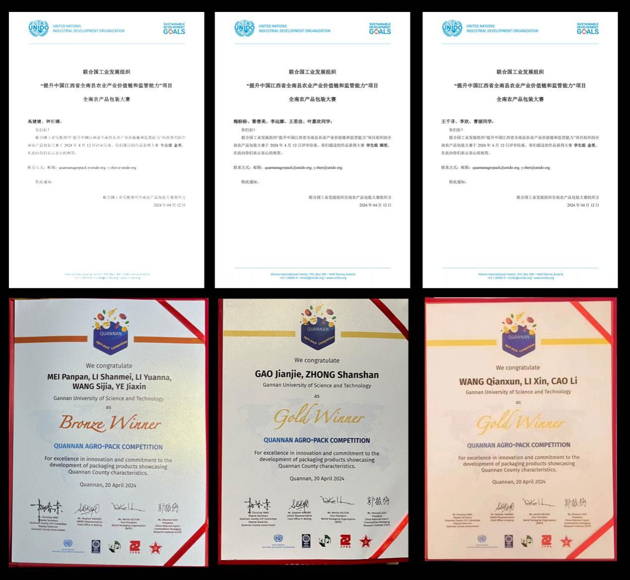 图一:联合国工业发展组织颁发的全南农产品包装设计大赛专业组金奖、学生组金奖及铜奖证书(图为我院师生在联合国工发组织全南农产品包装大赛颁奖现场与国务院商务部及省市领导合影留念)。