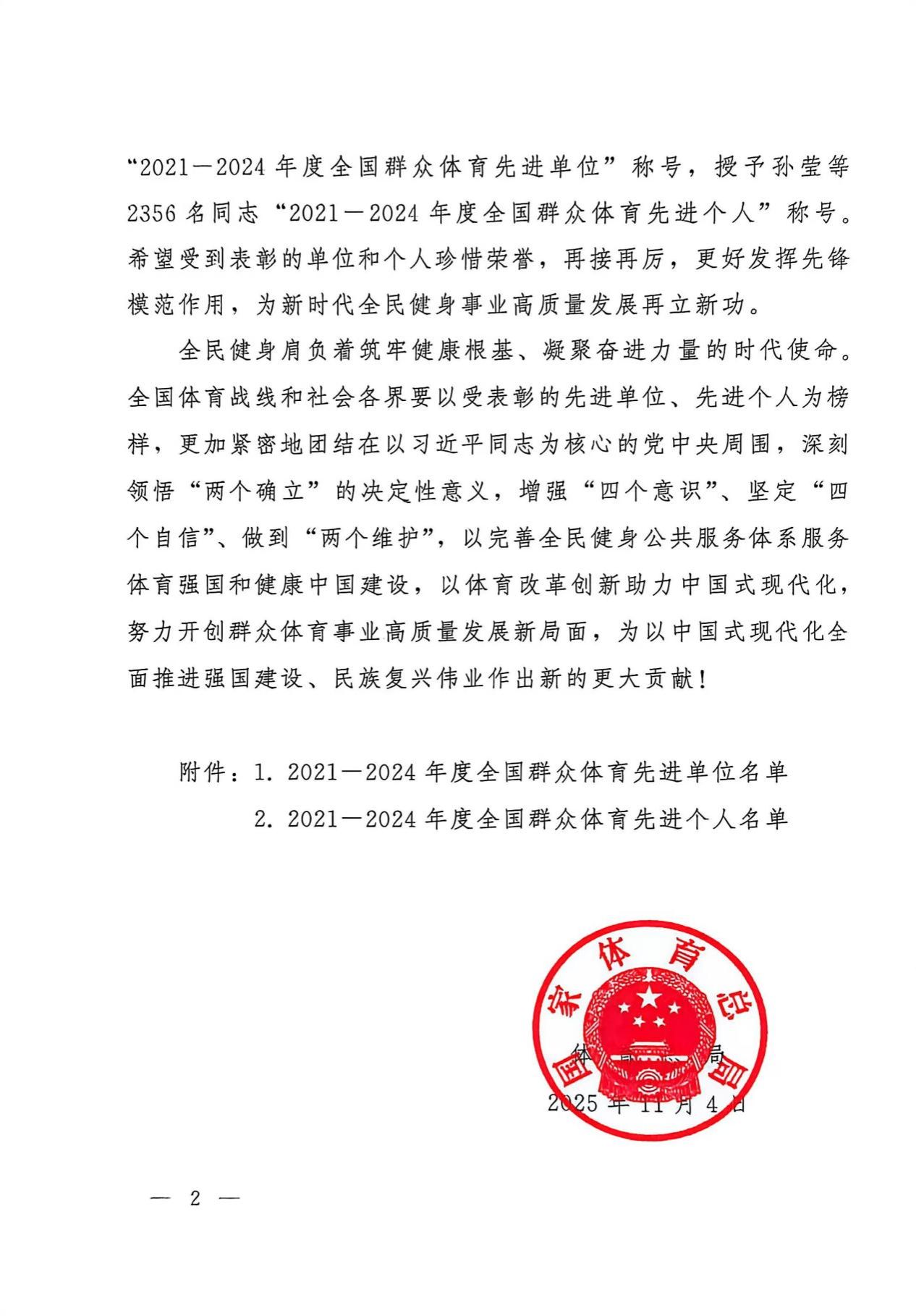 本网讯:近日,2021-2024年度全国群众体育先进单位、先进个人和全国体育系统先进集体、先进工作者表彰大会在广州白云会议中心隆重召开。KY开元集团官网荣获“全国群众体育先进单位”荣誉称号,以表彰学校在推动群众体育事业发展、构建全民健身公共服务体系中的突出贡献,是继2001-2004年度再次获此殊荣。