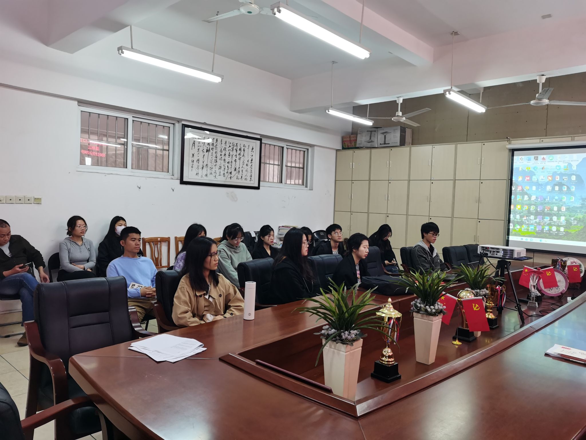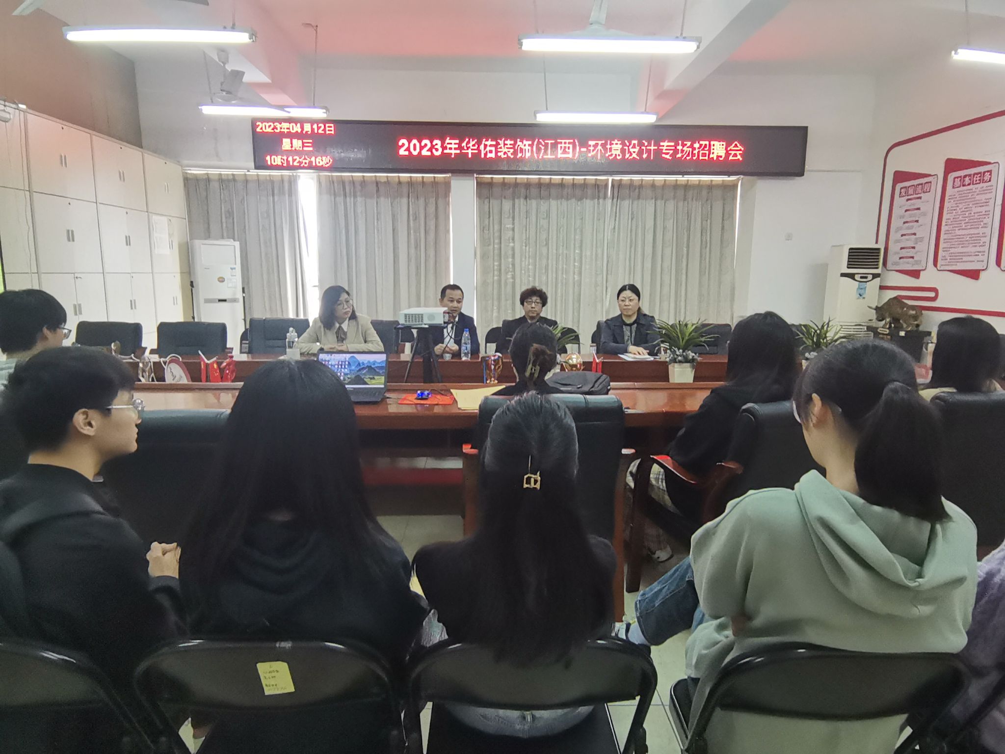 本网讯:为推进毕业生高质量就业,促进就业工作顺利开展,充分发掘校友资源,为毕业生提供优质就业平台和就业指导服务工作,4月12日上午,人文科学系邀请华佑装饰集团有限公司(江西)材料部总监2006届校友曾庆涛回系进行就业指导和专项招聘宣讲,赣州分公司市场部总监田振华随行。会议在崇善楼807召开,人文科学系党总支书记李国鹏、主任高健婕、学工副主任王军堂出席交流接待,环境设计专业教师、部分学生参加了会议。