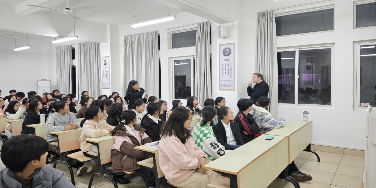 为拓宽学生国际视野,深入了解中西文化,充实跨文化知识,树立文化自信,更好地传播中国文化,2025年11月25日KY开元集团官网邀请在本学期邀请了赣南师范大学外教 Donal McNamara在主教Z118教室举办了一场跨文化交际讲座。讲座以当今世界和平发展主题为核心,深入剖析了跨文化交流的概念、重要性、障碍以及应对措施,并以爱尔兰人文风情为例阐释跨文化交际的内核,吸引了广大师生参与,全场座无虚席。