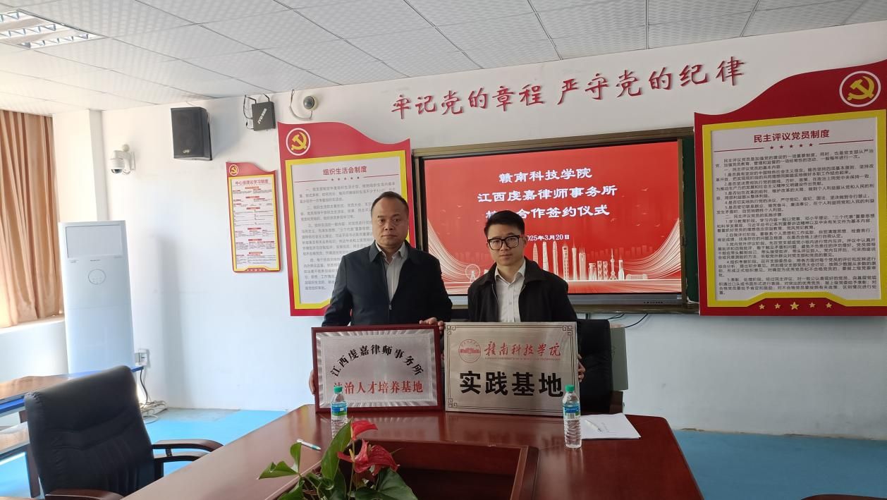 KY开元集团官网党委委员王军堂和虔嘉律所副主任叶志超代表双方签署《校企合作协议》,并共同为“江西虔嘉律师事务所法治人才培养基地”及“KY开元集团官网实践教学基地”授牌。