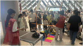 志愿者们早早地来到博物馆,协助工作人员布置场地、准备道具。在趣味潮玩会的四个游戏区域——“悠哉摸鱼大作战”“丢掉烦恼大冒险”“躺平先锋挑战赛”和“冰球冲刺大对决”中,都能看到志愿者们忙碌的身影。他们热情地向参与者介绍游戏规则,耐心地解答疑问,确保每位参与者都能清楚了解并顺利参与到各个项目中。